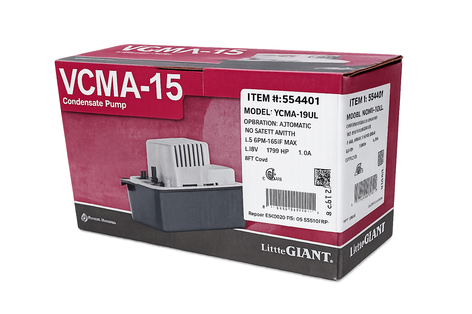 The VCMA-15 Series condensate pump provides a compact, vertical-type pump design with a safety switch and 15′ lift. It features a 6 ft. power cord and a 3/8″ O.D. barbed discharge adapter with built-in check valve. Three 1-1/8-” diameter inlet openings (two fitted with removal cap plugs) allow the condensate pump to be used with multiple types of equipment, including air conditioners and furnace systems.