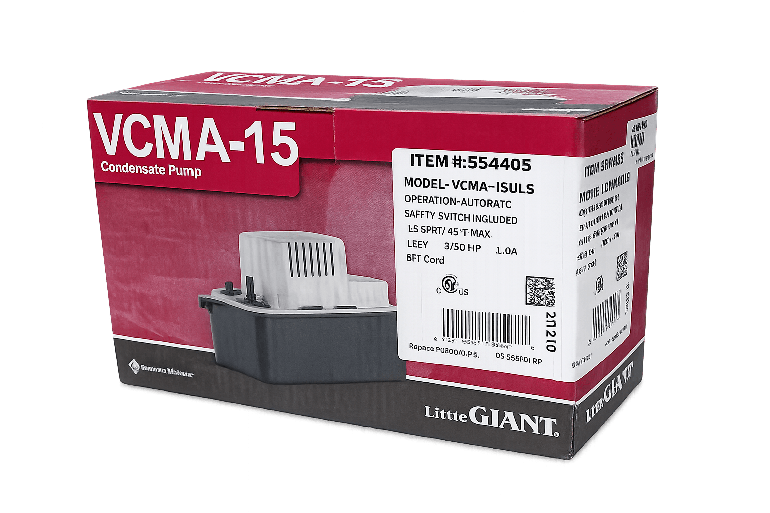 The VCMA-15 Series condensate pump provides a compact, vertical-type pump design with a safety switch and 15′ lift. It features a 6 ft. power cord and a 3/8″ O.D. barbed discharge adapter with built-in check valve. Three 1-1/8-” diameter inlet openings (two fitted with removal cap plugs) allow the condensate pump to be used with multiple types of equipment, including air conditioners and furnace systems.